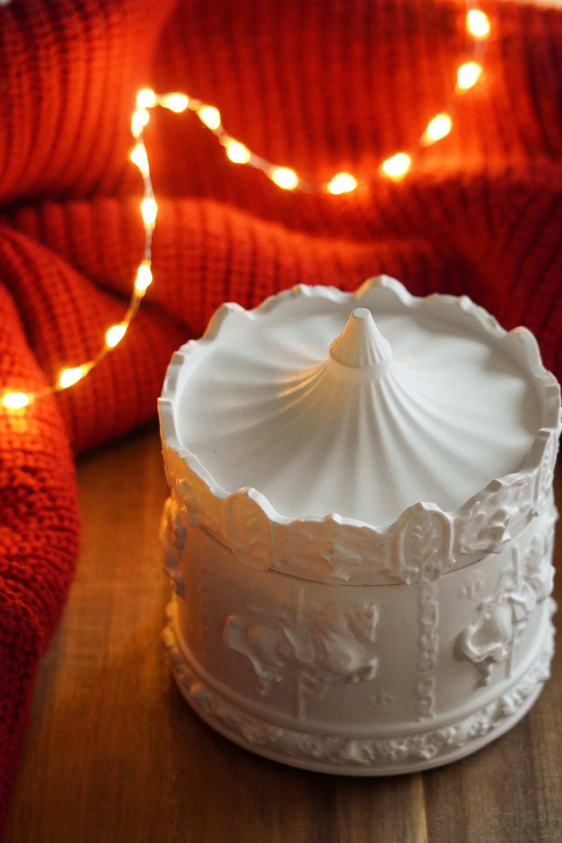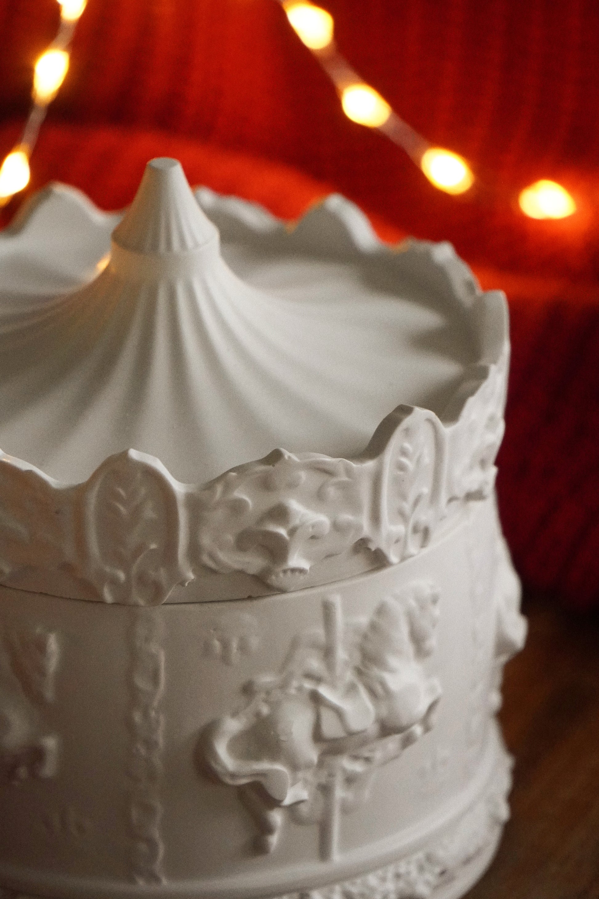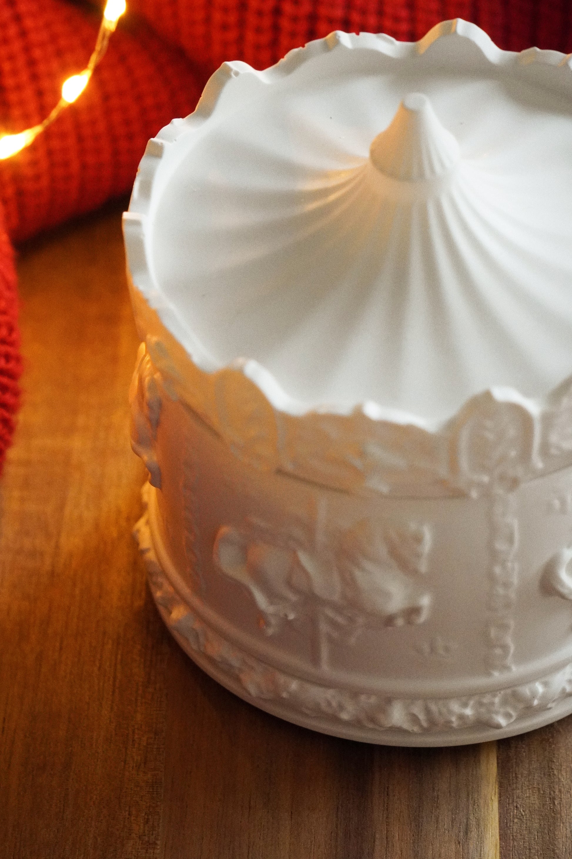 O copo de gesso cerâmico artesanal, inspirado num carrossel, faz desta uma peça estética e encantadora.