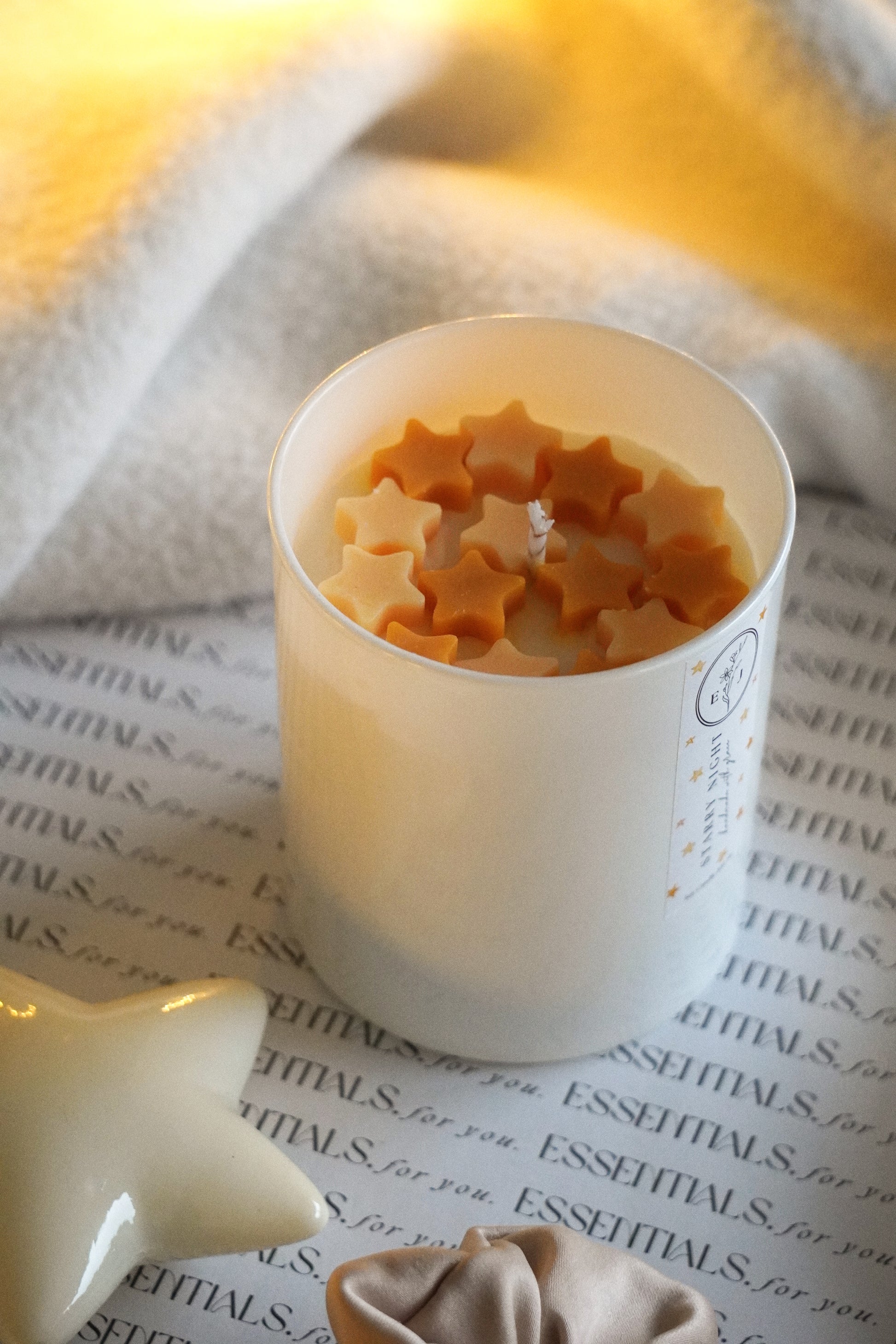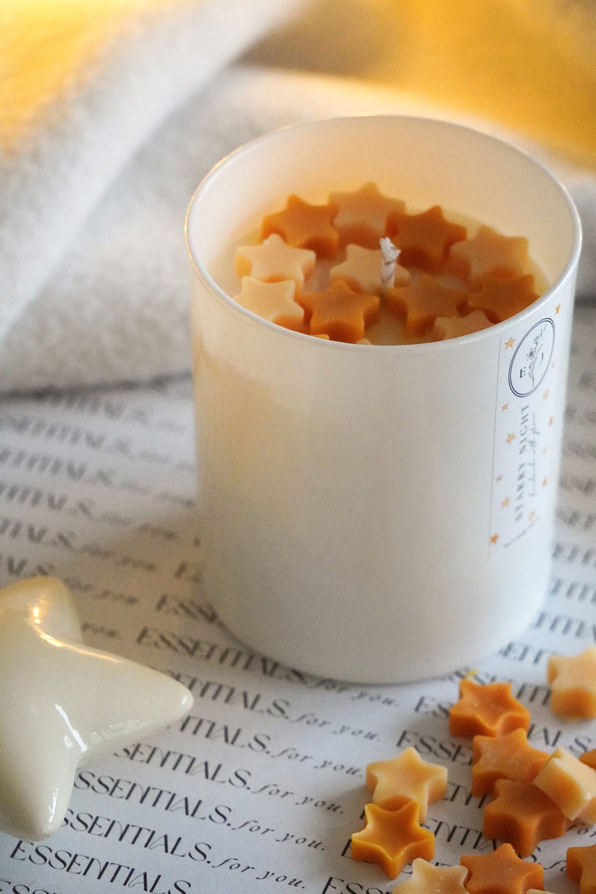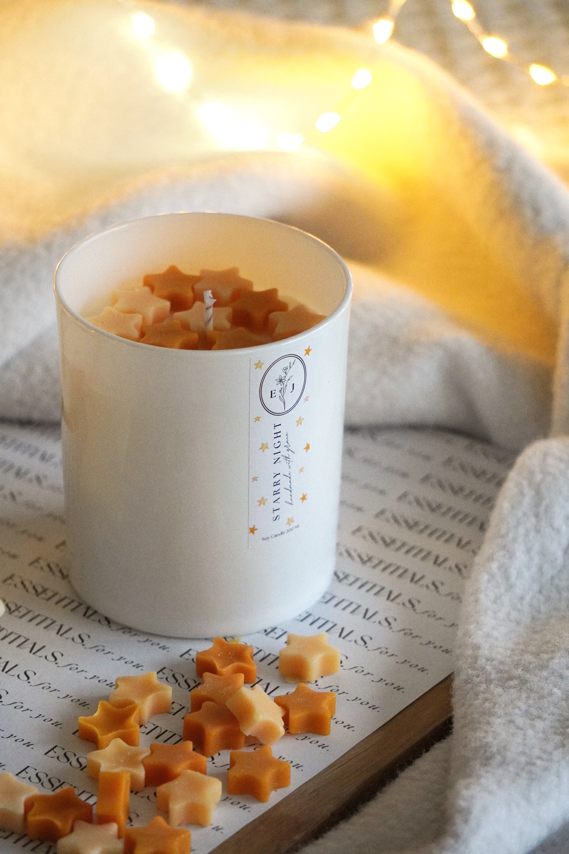 Decorada com estrelas amarelas e laranjas, é uma vela que te leva para noites tranquilas, luzinhas acesas e momentos simplesmente teus.