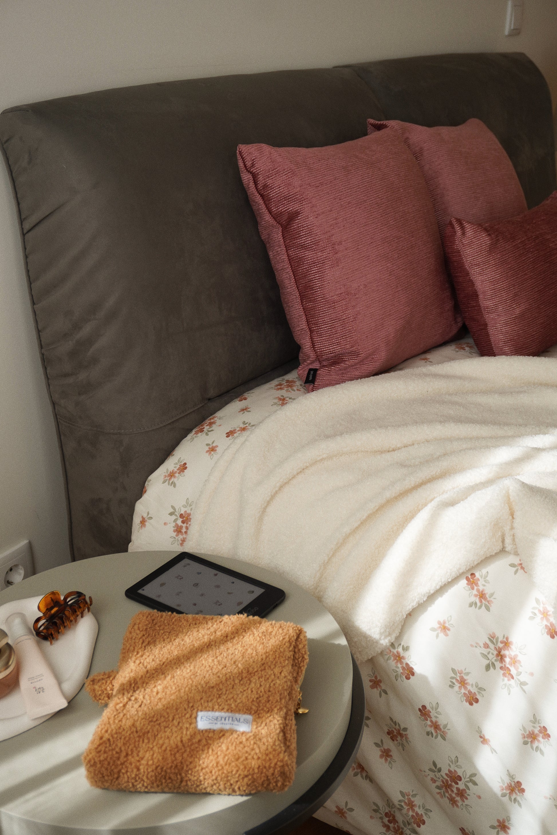 O tom caramelo e o tecido fofo e suave transmite-te serenidade, inspirando o cenário ideal para momentos de pausa e leitura. Inclui um bolso interior para outros pequenos ESSENTIALS, e o fecho dourado e a medalha ESSENTIALS completam a peça com aquele toque subtil que torna cada momento ainda mais especial.