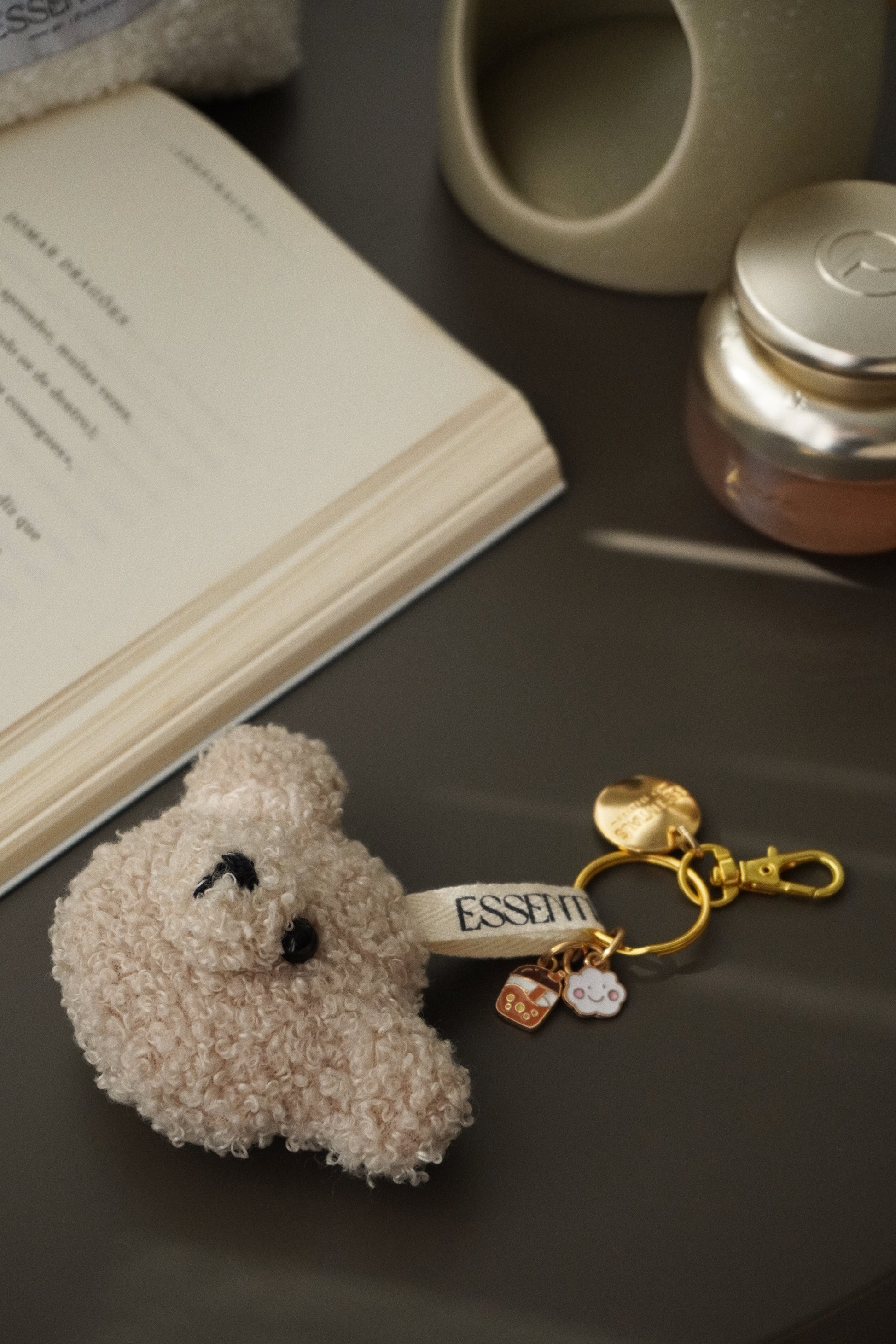 〰️ O porta-chaves vem com a medalha ESSENTIALS, 2 charms aleatórios e um peluche costurado à mão.