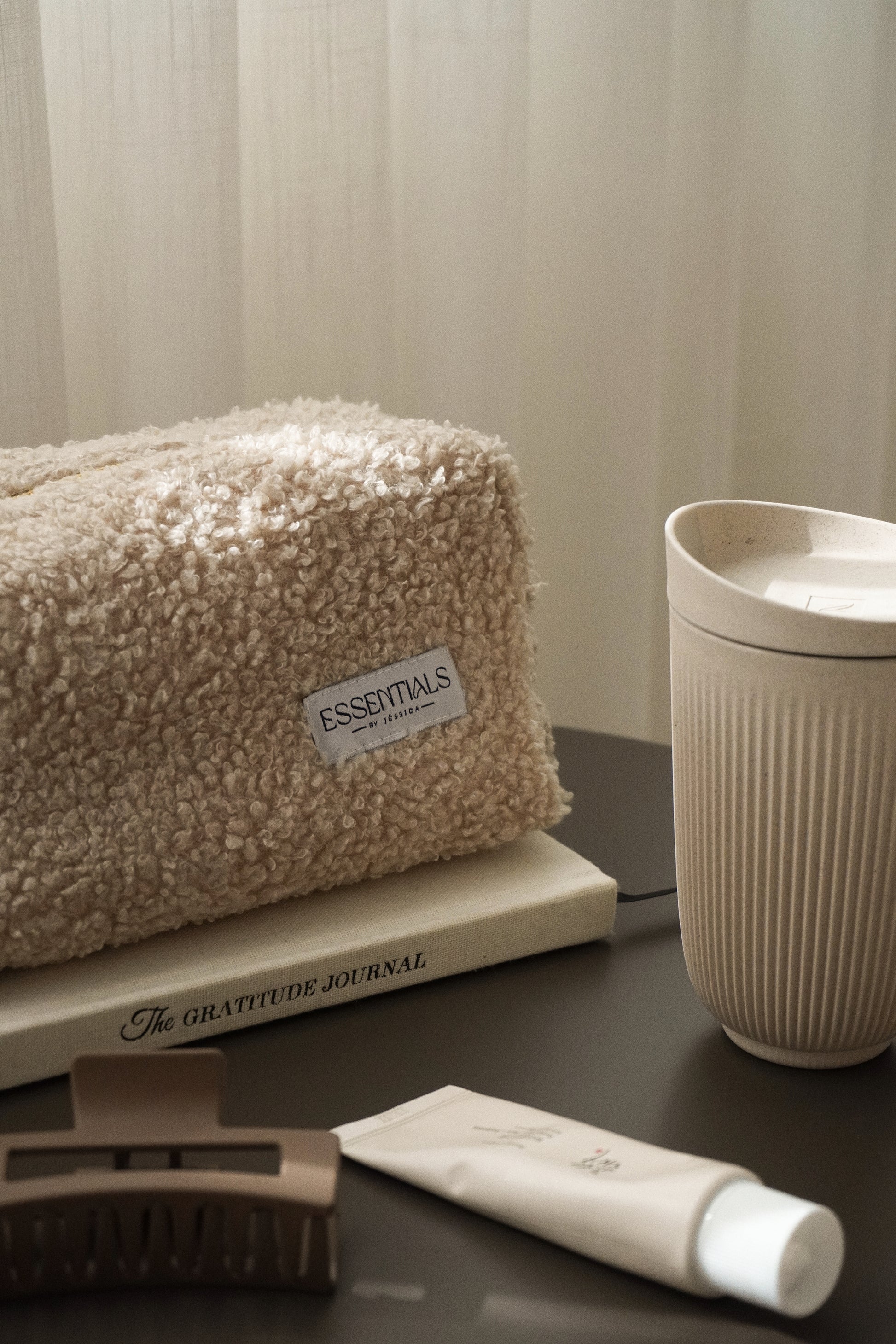 O seu tom bege neutro transmite leveza e sofisticação, enquanto o seu tecido incrivelmente fofo traz uma sensação de conforto, tornando cada momento de selfcare ainda mais especial. O fecho dourado e a medalha ESSENTIALS acrescentam um toque de brilho subtil, um pequeno luxo para o teu dia a dia.
